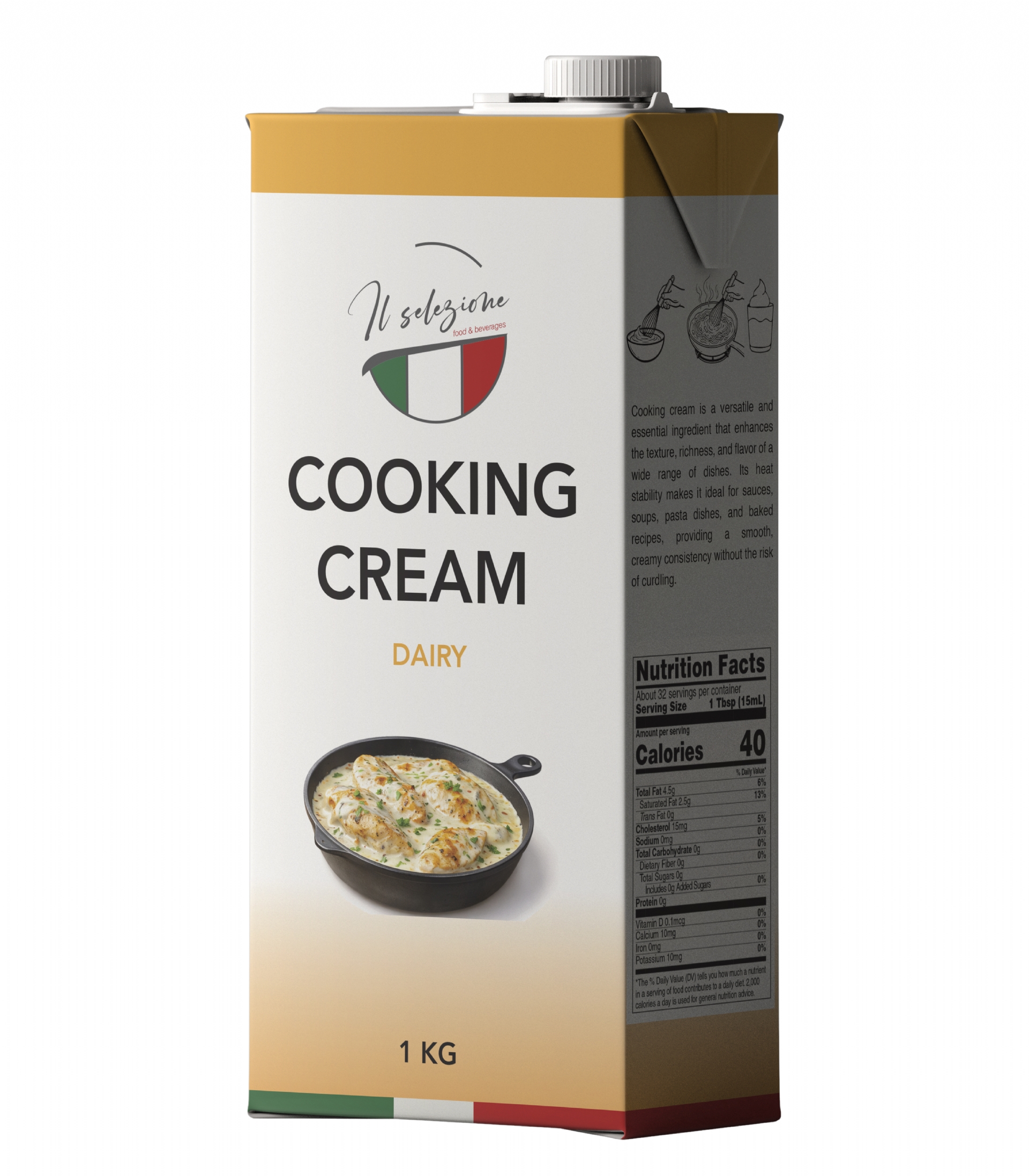 Save time in the kitchen by preparing delicious homemade pasta in just a few minutes with our Cooking Cream Dairy Product. Surprise your family not only with exotic Italian cuisine, but also by adding variety to your everyday menu—perfect for chicken dishes and many other recipes.